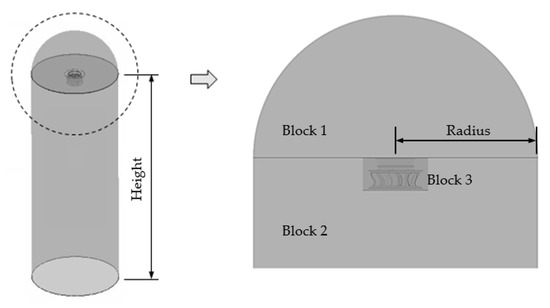 The original plenum fan model PRL-560L0(LG Electronics, Korea) was used in this study. The geometric shapes are shown in Figure 1, and the specifications are shown in Table 1. Figure 2 shows the computational domain. The radius of the computational domain was three times the diameter of the plenum fan, and the height was set to 30 times the width of the plenum fan. In the figure, Block 1 is the area at which the flow enters through the bell mouse, Block 2 is the fan part and the rotating flow area, and Block 3 is the area where there is rotational flow. The flow field was treated as a wall in this work. As a boundary condition, the inlet condition was the pressure inlet condition, the outlet condition was the mass flow rate condition, and the air density corresponded to 25 °C. The size of the domain was considered large enough to avoid interference in the flow.