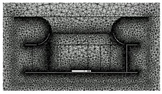 The fan’s inlet and outlet were set to an open boundary condition, the inlet pressure was set to atmospheric pressure, and the wall condition was set to a no-slip wall condition. The impeller’s rotation speed was set to 1100 rpm, and the simulation was carried out based on the flow rate given in the product. The numerical calculations were discretized using three-dimensional, incompressible Reynolds-averaged Navier–Stokes (RANS) equations. The normal numerical analysis was carried out using the pressure based on the fully coupled implicit method. The turbulence model used a shear-stress transport (SST) model, which is useful for analysis of the flow separation.