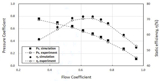Figure 11 shows the performance comparison between the original model and the optimized model. Both the static pressure and the static efficiency of the optimized model were improved compared with those of the original model. The highest efficiency of the optimized model was 78.1% at the point with a flow coefficient of 0.675, which was an improvement of more than 6.3% compared with the original model.