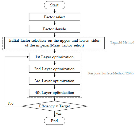In this study, the iteration method was introduced to optimally design the plenum fan with a three-dimensional blade. The flowchart of the iteration method used in the calculation is shown in Figure 8. The Taguchi method [20,21] was used for initial factor selection as a powerful statistical tool for designing an experiment utilizing orthogonal array tables. Orthogonal arrays that depend on the number of factors and levels are used to study parameter space. Numerous input variables can be assessed to determine their contribution to the output response variable using a fewer number of experimental runs. In this study, an experimental plan was established using the Taguchi method to select the initial factor values for each layer. Experimental plans were established using L12 (211) orthogonal arrays in Layers 1 and 4, and L16 (212) orthogonal arrays in Layers 2 and 3.