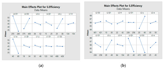 The parameters of Layers 1, 4, and 2, 3 were simultaneously considered to attain the initial values for each layer. Layer 1 was selected as the plane where the blade met the shroud, and consisted of six design variables: , , , D1, D2, and height. Layer 4 was selected as the plane where the blade met the back plate. It consisted of five design variables: , , , D1, and D2. To select the major design variables, L12 orthogonal arrays were used for 11 factors, and screening analysis was performed by computational simulation. The main-effect analysis results of Layer 1 and Layer 4 are shown in Figure 9a, and the effects of at Layer 1 and D1, D2, and at Layer 4 were significant.