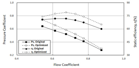 After the first and second optimizations, the shape of the initial model could be determined. Once the initial shape was determined, the optimal design values were obtained from Layer 1 using the RSM. The iteration was performed by applying this value to the optimization of Layer 2. The calculations were repeated and finally converged to the target static pressure efficiency of 78% to complete the optimization. The optimal design values of the blades designed by the iteration method are shown in Table 3. The blade shapes of the original and optimized models are shown in Figure 10.