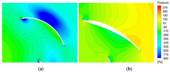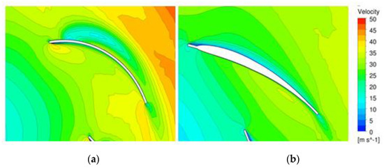 Figure 14 shows the relative velocity distributions in the middle section of the original and optimized models. There was a low-velocity region on the suction surface of the original model, and there was a high-velocity region on the blade’s outlet surface. In the optimized model, homogeneous velocity distributions on the suction surface and the channel could be observed. The inhomogeneous velocity distribution on the suction surface or outlet surface was the main cause of flow separation, which caused fluid flow friction, resulting in large losses and performance degradation.
