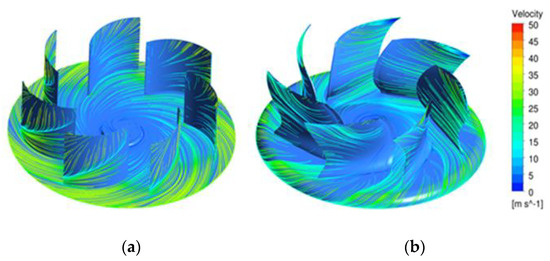 Figure 15 shows the velocity streamline at the blade and the channel. In the original model, the fluid flow on the suction and outlet surfaces did not flow along the blade airfoil, and separation occurred. In the optimized model, on the other hand, some flow separation occurred at the blade tip, but the overall flow was stable along the blade airfoil. This stable flow reduced the fluid flow friction in the impeller to increase the performance and reduce noise.