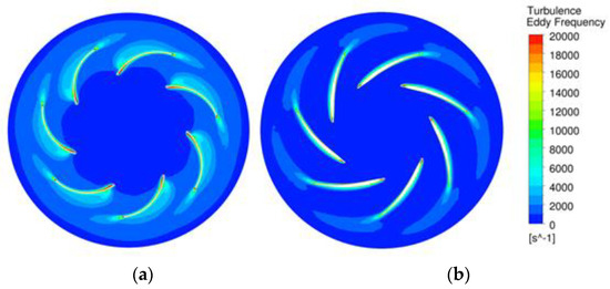 Turbulence eddy frequency (at 1100 rpm): (a) Original model; (b) Optimized model.
