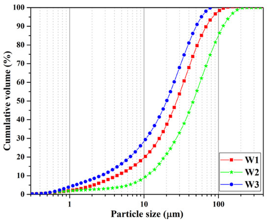Figure 1 displays the particle size distribution of the ash specimens obtained using different grinding techniques. Among all ash specimens, those ground only with disintegrator presented coarser particles in comparison with those ground using ball mill and combination of both techniques. The percentage of the finer particle was increased when ground with a combination of ball mill and disintegrator. Specific surface area of 14528 cm2/g, 7251 cm2/g, and 16124 cm2/g was measured for W1, W2, and W3 ash specimens, respectively (Table 1).