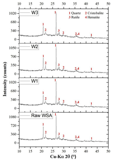 XRD results are shown in Figure 2. It can be seen that the peaks for crystalline silica (at 20°) reduced for W1 and W3 ash specimens as compared to that of W2 specimen. The decrease in height and broadening of the peak for silica is an indication of amplified amorphousness. It may be due to the availability of the inner amorphous silica due to extensive grinding [24]. The oxide composition of the ash specimens was determined via XRF analysis (Table 1). The combined percentage of SiO2, Fe2O3, and Al2O3 (72%) meet the least requirement of ASTM C618 [31] for a pozzolanic material. Table 2 shows the oxide composition of WSA used in the present study and other ARAs used in previous studies. It can be seen that RHA demonstrated highest content of silica while POFA presented the least content.