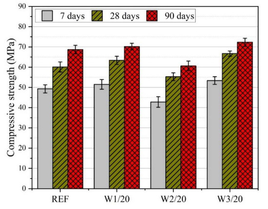 Figure 3 depicts the results of the compressive strength test for various mortar types. Compressive strength enhanced with increasing curing age. For instance, control (REF) mortar specimens demonstrated a compressive strength of 49.3 MPa, 60.1 MPa, and 68.7 MPa at 7, 28, and 90 days, respectively. Apart from this, the results clearly describe that the compressive strength increased for the specimens with finer ash particles (W1 and W3 types). For example, a compressive strength of 51.5 MPa, 63.4 MPa, and 70.2 MPa was observed for W2/20 mortar specimens at 7, 28, and 90 days, respectively. W3/20 mortar specimens presented a compressive strength of 53.4 MPa, 66.7 MPa, and 72.3 MPa at 7, 28, and 90 days of curing, respectively. Apart from this, the addition of coarser ash particles reduced the compressive strength. The specimens containing 20% W2 type ash particles demonstrated a compressive strength of 42.8 MPa, 55.3 MPa, and 60.6 MPa at 7, 28, and 90 days of curing, respectively.