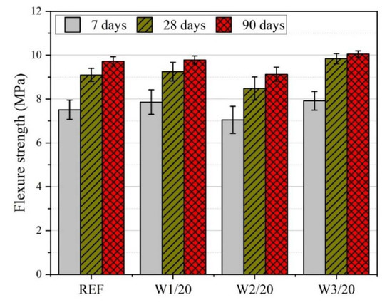 Figure 4 displays the results of flexure strength test conducted on various mortar specimens. Flexure strength increased with increasing curing age. For instance, control (REF) specimens demonstrated flexure strength of 7.51 MPa, 9.1 MPa, and 9.72 MPa at 7, 28, and 90 days, respectively. Similar to the results of the compression testing, flexure strength increased with the inclusion of finer ash particles. For instance, a flexure strength of 7.86 MPa, 9.25 MPa, and 9.78 MPa was observed for W1/20 mortar specimens at 7, 28, and 90 days. Similarly, W3/20 mortar specimens demonstrated flexure strength of 7.92 MPa, 9.84 MPa, and 10.05 MPa at 7, 28, and 90 days of curing. On the other hand, the addition of coarser ash particles caused a reduction in flexure strength in comparison with the control mortar specimens. For example, W2/20 mortar specimens demonstrated a flexure strength of 7.05 MPa, 8.48 MPa, and 9.13 MPa at 7, 28, and 90 days of curing, respectively.
