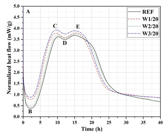 Isothermal calorimetry was employed on various mixes to investigate the rate of reaction at the very early ages (up to 40 h) as shown in Figure 5. Point A represents dissolution stage of cement in water, point B indicates the dormant time, point C represents hydration reaction at peak, point D represents sulfate consumption, and point E indicates increased aluminate activity [36]. The results demonstrate that the peaks amplified and shifted to former times when ash had introduced. Figure 5 makes it obvious that the mixes with W1 and W3 ash particles showed prominently amplified heat release peaks compared to the mixes with W2 ash particles. For instance, at point C (hydration reaction at peak), a normalized heat flow of 3.62 mW/g, 3.91 mW/g, 3.62 mW/g, and 3. 93 mW/g was measured for REF, W1/20, W2/20, and W3/30 specimens, respectively. It is mainly due to the amplified number of reaction sites for the finer ash particles which enhanced the hydration reaction [24,37]. The results of the study carried out by Cordeiro et al. [24] reveal that the ultrafine particles of SCBA caused an abbreviation of the induction period and amplified the peak heat release rate due to heterogeneous nucleation.