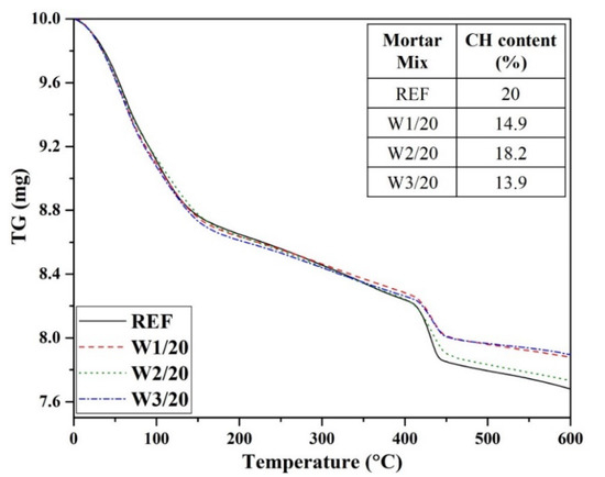 The tabulated data in Figure 6 shows the CH content calculated for various specimens. It is obvious that the control (REF) specimen demonstrated the highest content of CH (20%) amongst all the specimens. The specimens prepared with W3 ash particles depicted the least content (13.9%) of calcium hydroxide followed by those with W1 ash particles (14.9%). Contrary to this, a CH content of 18.2% was noticed for the specimens prepared with W2 ash particles. The results of TGA analysis suggest that the addition of WSA generated extra hydration products (C-S-H) by reacting with CH. A prominent reduction in CH amount due to the incorporation of finer WSA particles indicates the nucleation effect. Also, the inner amorphous silica was made available for pozzolanic reactions due to the grinding of the particles of WSA [24]. Summarizing, the pozzolanic, filler and heterogeneous nucleation effects were responsible for the enhanced performance of the finer ash particles [24,37].