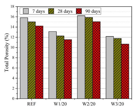Mercury intrusion porosimetry was carried out on the mortar specimens to examine the effect of WSA fineness on the overall porosity. Figure 7 illustrates the results of MIP analysis in terms of total porosity (%) measured at 7 days, 28 days, and 90 days. It is obvious that porosity decreases with increasing curing age irrespective of the constituents of mixes. It is primarily credited to the formation of additional hydration products with age, thus resulted in a densified microstructure. At the age of 7 days, reference mortar specimen presented 15.82% total porosity whereas at the age of 28 days and 90 days this value reduced to 15.01% and 14.22%, respectively. Furthermore, the inclusion of WSA triggered a decrease in the porosity of the mortar mixes irrespective of the replacement level. The decrease was more noticeable with the addition of finer WSA particles. For example, the total porosity for W1/20, W2/20, and W3/20 were measured 13.12%, 16.22%, and 12.16% at 7 days; 12.27%, 15.88%, and 11.78% at 28 days; 11.54%, 15.05%, and 10.68% at 90 days, respectively. It can be seen that total porosity reduced at the early ages as well. It means mainly filler effect attributed to the porosity reduction for the early ages and pozzolanic effect and filler effect imparted reduced porosity in the later ages [32,39]. Cordeiro et al. [33] reported that adding ultra-fine BA improved the pore structure and resulted in an enhanced durability-related performance.