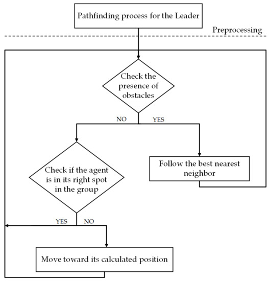 Our simulation can handle both group-group and group-obstacle interactions. There is a preprocessing step for the leader to calculate the best path to its target position using A* pathfinding algorithm [25] due to the simplicity and ability of this method to find the minimum cost solution. In our implementation, this algorithm works in a grid space with units (see Section 4 for more details) as the grid value that makes a smooth motion for all agents while not having large memory consumption. The proper position for each agent to follow, considering the group’s shape, will be calculated based on the leader and agents’ unit velocity. Meanwhile, in the moving direction, each agent can sense the density of obstacles around itself. If there is no obstacle in front of the agent and if the agent is not in its acceptable area, it will move toward the calculated location by adding two other half-planes toward the right direction, continuously. Finally, if the calculation of density around the agent determines the presence of obstacles, the agent will find its best neighbor which is more near to the leader and will follow the selected subleader until there is no obstacle near it (Figure 1). The stage of the flowchart that evaluates the position of agents depends on their proper locations in the group is simply done by computing the relative position for each agent (subtraction of them) and then, comparing the value with “T” as a predefined threshold (see Section 4 for more details). We clarify each step individually.