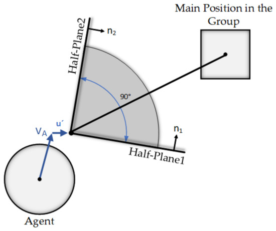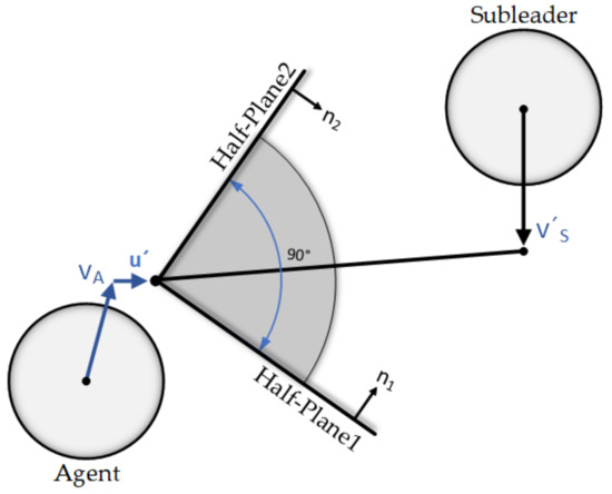 Hence, is a half-plane defining a set of allowed velocities leading agent A toward its proper position. This half-plane is pointing in the direction of or starting at the point of (Equations (5) and (6)).