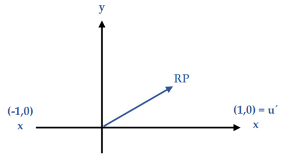 This section is for a situation when the calculated density is zero and the agents are forced to leave their proper area across the group to avoid other agents and obstacles from colliding. Having the right location for the agent, two half-planes will be added by rotating the vector calculated from the relative position between the agent and the right spot, with 45 degrees in two directions (Figure 3). Relative position (RP) calculates by the subtraction of the agent’s position from the proper position. The rotation of RP in two-dimensional space can simply calculate by the two matrixes for clockwise (Equation (3)) and counterclockwise (Equation (4)) rotations. For determining each half-planes, it is required to have three main vectors—the agent’s unit velocity, the normal vector of the half-plane toward the desired direction and a unit vector in one of the left or right directions of the moving path. Since in our case, the rotation degree () is 45, there is no need to calculate normal vectors because the two half-planes are perpendicular to each other. If the rotation degree changes to other values, the calculation of normal vectors is necessary.