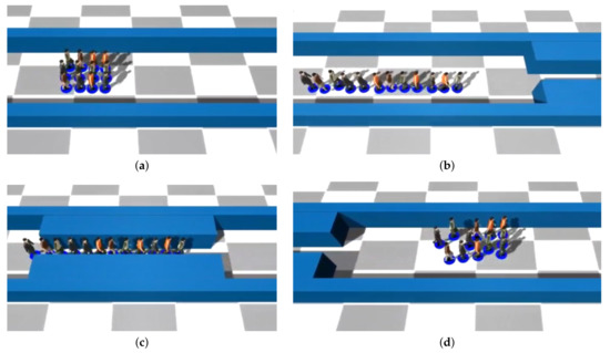The behavior of a group in front of a narrow space according to Reference [1]: (a) Agents in a uniform formation are approaching the corridor. (b,c) All of the agents will change their formation to the line shape at the same time for being able to pass through the narrow space. (d) They change to their previous formation all together after passing the corridor.