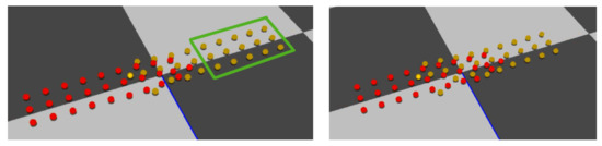 Another controversial feature of Reference [1] is that, in each cycle, each agent chooses some other members as its connection-agents among a predefined set called connection-neighbors. connection-agents is another subset of neighbors that the agent tries to stay close to. Making agents always being close to others yields to none-realistic avoidance behavior. In Figure 8, our method, agents have their independent manner for collision avoidance and formation maintenance. As it is noticeable, agents in one group that are far away from other avoidable agents in the opposite direction, will not disturb the group’s formation (the green rectangle). In our opinion, keeping the group’s formation should have a high priority. While in Figure 9, the marked agent (with the red circle around it) changes its direction and follows another agent although nearby its position, there are no avoidable agents in its front way and no reason to change the moving direction. Thus, there will be unnecessary movements for members in a group avoiding a small number of individual agents coming from the opposite direction. Accordingly, we can conclude that the process of keeping formation that should have a high priority for a group, has been given less attention in their work. However, in our work, groups try their best to not destroy their formation unless they have to.