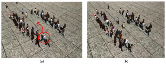 A group confronting individual agents coming from the opposite direction, according to [1]: (a) Although the agent in the red square has enough space to walk without any change in the group’s formation, it just follows its connected-agents without awareness of the surrounded area. This behavior makes unnecessary movements for all agents. (b) The big gap between the subgroups resulting from a small number of opposite agents is noticeable in this frame.