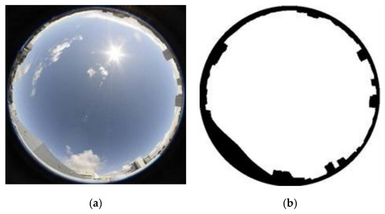(a) EA building of Glasgow Caledonian University (GCU) (N 55°51′57.71″, W 4°15′00.49″) and (b) SVF = 0.774.