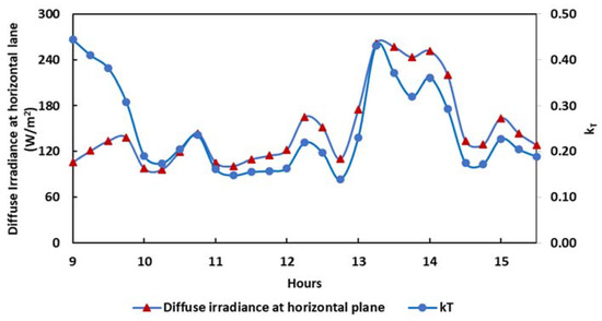 where kT → 0 means overcast and kT → 1 means clear days. The kT value of the experiment was between 0.14 and 0.44 confirming that the diffuse light was high during the period of the experiment. The diffuse irradiance at the horizontal plane is calculated depending of the value obtained previously due to the fact that the equation varies according to it [37]. Both the kT and the diffuse irradiance at the horizontal plane values during the experiment are presented in Figure 7.