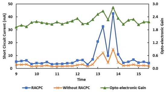 The experiment was performed on the 15th of March 2017 from 9:00 a.m. to 15:30 p.m. with a temperature of 11.9 °C; and an inclination of 31.96° facing south. The short circuit currents from the RACPC-PV device and the bare PV cell were measured every 15 min, and using the empirical functions shown below, the global irradiation was separated into direct and diffuse irradiation through the kT factor. This takes into account the global irradiance EG,hor, the extra-terrestrial irradiance E0 that depends on the distance between the sun and the earth and is the irradiance before reaching the atmosphere (the average value is 1361 W/m2) and the sun height γs [37] for each specific time.
