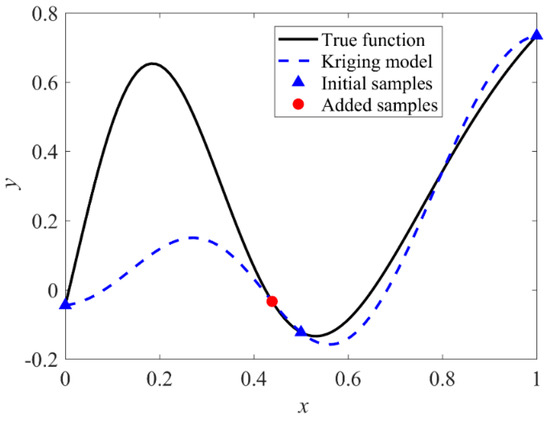 In this illustrated example, the weight parameters are in the first iteration. It is shown that the algorithm focuses more on global exploration than local exploitation. Therefore, another sample point is added, and the corresponding Kriging model is refreshed, which is shown in Figure 3.
