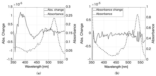 The absorbance change (solid line) and absorbance (dashed line) spectra of (a) rhodamine 6G (R6G) aqueous solution in 0.3 mm-thick cell, where the irradiation intensity is 640 W/cm2, and of (b) R6G in PVA, where the irradiation intensity is 360 W/cm2. Both the absorbance and its change were measured with the multi lock-in amp. system.