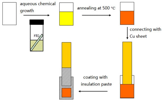 The preparation of α-Fe2O3 photoanodes is illustrated in Figure 1. After the α-Fe2O3 was formed, the blank of the FTO substrate was stuck to a Cu sheet by silver conductive adhesive. Then the margin and the back of the FTO substrate was coated by insulation paste to achieve an active area of around 1 cm × 1 cm.