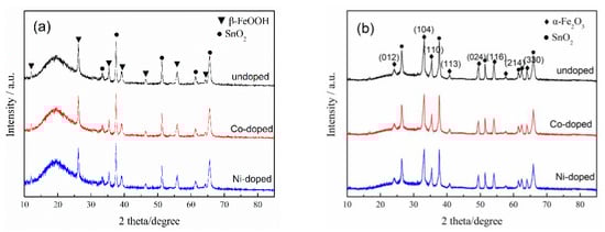 Considering Co and Ni are in the same group and the same period as Fe (i.e., VIII group and the 4th period) in the periodic table of elements, and the three elements have similar chemistry, we hypothesize that the in situ doping of Co or Ni into α-Fe2O3 may have little influence on the structure of α-Fe2O3. The Co or Ni doping into α-Fe2O3 has been reported in the literature [,,,]. Hou et al. [] synthesized a three-dimensional branched Co-doped α-Fe2O3 nanorod/MgFe2O4 heterojunction array by hydrothermal deposition. Their results suggested that the Co doping can effectively enhanced the PEC activity of α-Fe2O3 via extending the light-absorbing region and accelerating the charge carrier separation efficiency. Suresh et al. [] prepared Co-doped α-Fe2O3 nanocrystalline via a hydrothermal method and characterized the sample by various techniques. The Co-doped α-Fe2O3 showed a pure α-Fe2O3 crystal phase without any impurity phases. The increase in the Co concentration could effectively increase the agglomeration of the particles. But the PEC performance of the Co-doped α-Fe2O3 was not investigated by them. Wang et al. [] improved both the photocurrent and the onset potential of α-Fe2O3 nanorod photoanodes by in situ Co and ex situ Sn co-doping. The Sn doping mainly contributed to the increased carrier density, while Co doping mostly improved the surface kinetics of oxygen evolution reaction on the Fe2O3 nanorods. Lassoued et al. [] prepared Ni-doped α-Fe2O3 nanoparticles by the chemical co-precipitation method and examined the photocatalytic activity for the degradation of model organic pollutants. Their results suggested that the adding of Ni didn’t change the crystal phase but decreased the size of the α-Fe2O3 nanoparticles. The incorporation of 8 mol% Ni into the α-Fe2O3 decreased the band gap from 2.02 eV to 1.81 eV.