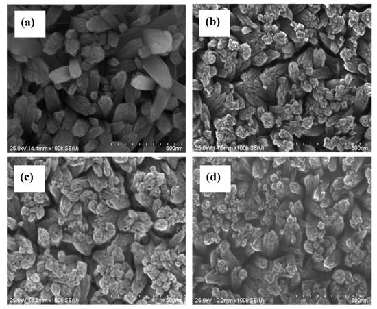 Figure 5 displays the microscopic morphology of the as-prepared β-FeOOH and α-Fe2O3. The β-FeOOH is presented as a nanorod array that vertically grows on the substrate (Figure 5a). The α-Fe2O3 samples also show a similar morphology except for a slight volume contraction (Figure 5b), suggesting a topological transformation from β-FeOOH to α-Fe2O3. When Co or Ni dopant was introduced, the morphology of the α-Fe2O3 remained almost the same as exhibited in Figure 5c,d. The three α-Fe2O3 samples were all comprised of bunches of nanorods. Each bunch of nanorods had a diameter of about 50 nm and each nanorod had a diameter of about 5–10 nm. The small diameter is beneficial to the transport of photoinduced holes to the semiconductor-electrolyte interface, although the α-Fe2O3 nanorods do not have the merit of a high conductivity since they are not oriented in the (0 0 1) direction on the substrate [,,].