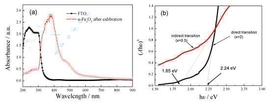 Figure 6a shows the UV–visible absorption spectrum of the α-Fe2O3 nanorod array. The absorption band is mainly located between 300 nm and 550 nm. Electron transition on the energy levels of α-Fe2O3 can be divided into direct transition and indirect transition, corresponding to O2−→Fe3+ and Fe3+ 3d→3d, respectively []. The energy gaps of direct transition and indirect transition could be estimated by Equations (4) and (5), which were derived from Equations (2) and (3). The plots of (Ahv)2 or (Ahv)0.5 against hv (i.e., Tauc plots) of the undoped α-Fe2O3 are displayed in Figure 6b. The intersection of the linear extension of the Tauc plots with x axis represents the energy gap of direct transition or indirect transition []. They are 2.24 eV and 1.85 eV, respectively, in the present work. The energy gap of the direct transition estimated by the Tauc plot is close to its theoretical value (2.1–2.2 eV). Vayssieres et al. [] observed that the energy gap of α-Fe2O3 nanorods increased by 0.3–0.6 eV compared with α-Fe2O3 bulk due to the quantum confinement effect of nanorods. However, the quantum confinement effect was not observed in this study.