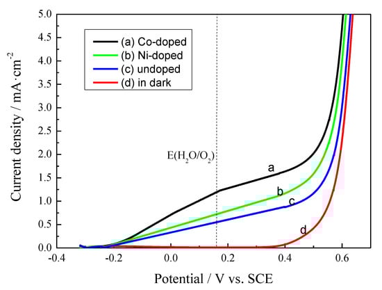 Figure 7 shows the I-V plots of the as-prepared α-Fe2O3 samples. The equilibrium potential of water oxidation (i.e., E(H2O/O2)) is 0.1572 V vs. SCE in 1 M KOH electrolyte. For the undoped α-Fe2O3 in dark, the initial potential for the occurrence of current is 0.36 V, more positive than the equilibrium potential due to the existence of overpotential. When the undoped α-Fe2O3 sample is under solar irradiation, the initial potential moves to −0.22 V, much more negative than the equilibrium potential, indicating an obvious PEC effect. The doped α-Fe2O3 samples exhibit a similar initial potential to the undoped α-Fe2O3 under illumination. The initial potential of photocurrent is generally considered as flat band potential. The three samples have similar flat band potentials, which suggests that the doping of 5% Co or Ni does not change the energy band structure of the α-Fe2O3 nanorod array []. This conclusion is consistent with that derived from the Tauc plots (see Section 3.3).
