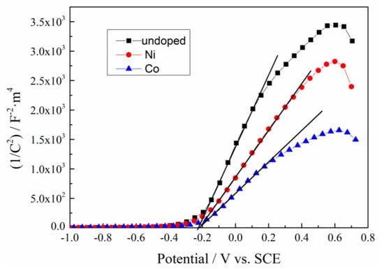 In order to explain why the PEC activity of α-Fe2O3 was enhanced by Co or Ni doping, M–S plots of both doped and undoped α-Fe2O3 samples were measured and shown in Figure 8. All the samples exhibited a positive slope, indicating they are all n-type semiconductors with electrons as majority charge carriers. The slope of the linear part of the M-S plots could be used to estimate the concentration of charge carriers (Nd) according to Equation (6).