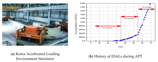 In this study, the Korea Expressway Corporation Research Institute (KECRI) in Hwaseong-si, Gyeonggi-do, South Korea, which has a Korea Accelerated Loading Environment Simulator (KALES) system (Figure 2a) was designated as a testing site. This simulation system with a total area of 2060 m2 was specially developed for the acceleration simulation by the KECRI in 1999 [16]. The heavy vehicle simulators (HVSs) were operated by triaxle with dual tires going 20–22 km/h and were driven across as illustrated in Figure 3. A single axle load was increased as shown in Figure 2b and the ESALs were accumulated as the day of the APT progressed. The APT was terminated after about 2 million ESALs for 70 days.