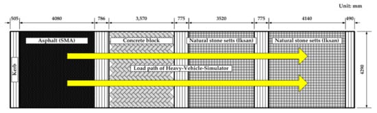 Natural stones have generally been introduced as pavers for specific areas with low traffic volumes such as car parks, sidewalks, and historically preserved sites [1,2,3]. In particular, stone pavements are frequently required in historic areas or cities because of their architectural beauty and environmental aspects [1,4,5,6]. Generally, the use of stone pavers for a historical aesthetic is suggested for areas with light traffic volume. As the quantity and weight of vehicles have increased, the deterioration of structured pavement has also increased many-fold.