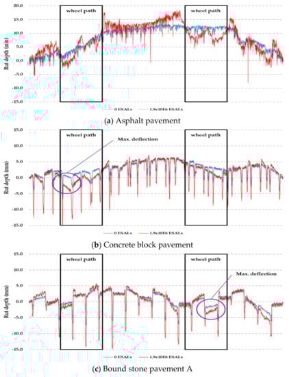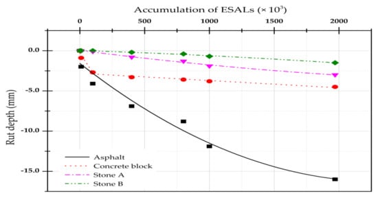 Figure 6 shows plotted data of rut depth measurements depending upon the number of cumulative ESALs. As illustrated in the graph below, rutting continuously increased over the ESALs. The largest and smallest rut depths were measured in bound stone pavement B and asphalt pavement, respectively. Bound stone pavement A showed relatively greater rutting compared to stone pavement B. In this circumstance, the different application of material types of base courses would lead to the difference. In the case of concrete block pavement, the great amount of rutting (3.0 mm) rapidly developed until 100,000 ESALs and the rut depth linearly increased up to 4.5 mm. The initial damage progressed because of the compaction of laying sand caused by wheel loading. Regarding asphalt pavement, it presented the fastest ratio of rutting among the tested pavements. In practice, the rutting ratio would be accelerated by the additional rut depth created by high temperature.