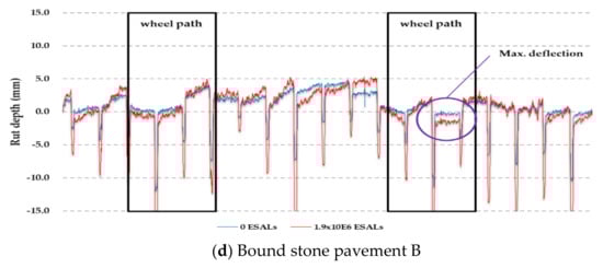 Finally, the maximum rut depth in bound stone pavement B (Figure 5d) was 1.5 mm, and it showed a smaller value compared to bound stone pavement A. The deeper stone pavers and different material of base courses used in both stone pavements influenced the bearing capacity of these pavement structures. As a result of conducting a visual inspection after the accelerated simulation, there was partial damage in numerous places and loss at the top of joint mortar in the wheel travelling sections. Owing to the defeat of joint material, a deeper rut depth at joints was logged compared to the original measurements. The distinctive deterioration was not recognized further in this type of pavement, excluding the loss in the joint mortar.