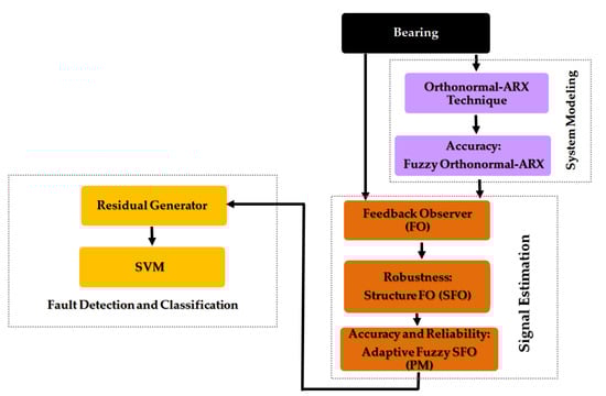 In this work, a hybrid-based approach is developed for fault diagnosis in REBs. First, fuzzy orthonormal-ARX is used to model the vibration and acoustic emission (AE) for bearing signals. Next, to estimate the signals, a feedback observer (FO) is developed for two kinds of signals. Then, to solve the challenge of robustness in feedback observer, the multi-structure technique is represented to develop a multi-structure feedback observer (SFO). Also, the fuzzy technique is used to improve the accuracy of the multi-structure feedback observer. Finally, an adaptive technique is used to optimize the multi-structure parameter, which is important to improving robustness and accuracy. The fuzzy orthonormal-ARX adaptive fuzzy logic-structure feedback observer (proposed method) is used for accurate signal estimation. After generating the energy residual signal, the SVM is used for fault classification. The effectiveness of the proposed method for fault detection and identification is compared with that of SFO and FO and evaluated using two different datasets: (a) the Case Western Reverse University (CWRU) vibration bearing dataset to test single-type faults [,], and (b) the Smart HSE Lab AE bearing data set to test multi-type faults [,,]. Figure 1 illustrates a block diagram of the fuzzy orthonormal-ARX adaptive fuzzy logic-structure feedback observer. The main contributions of this research are: