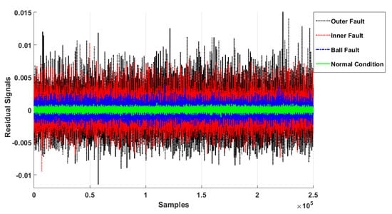 Thus, a fault can be identified based on the differences between residual signals in different conditions. Figure 3 illustrates the residual signals in normal and anomalous conditions based on the proposed method.