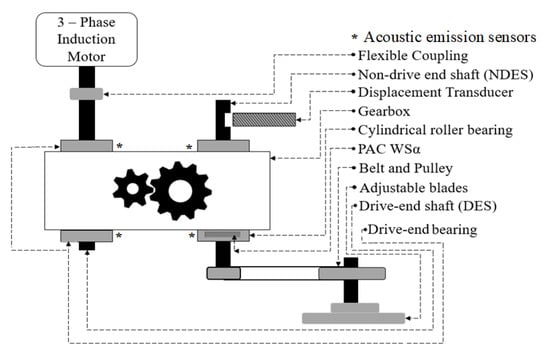 The SHSE acoustic emission dataset is used to test the effectiveness of the proposed algorithm using AE multi-crack faults. An AE sensor is used to collect data in various conditions including normal conditions, ball faults, inner (IR) faults, outer (OR) faults, inner-ball (IR-Ball) faults, inner-outer (IR-OR) faults, and inner-outer-ball (IR-OR-Ball) faults. The sampling rate of the record data is 250 kHz under four different rotational velocities (300 rpm, 400 rpm, 450 rpm, and 500 rpm) for two crack sizes: 3 and 6 millimeters in diameter. Figure 5 illustrates the bearing data collection testbench. Table 2 shows the SHSE Lab acoustic emission bearing dataset [].