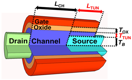 The device structure used in this work is similar to that in [16], except a lateral channel direction considering the compatibility with the state-of-the-art CMOS technology for a sub-5 nm-technology nodes [31] (Figure 1). It is named as a surrounding channel nanowire (SCNW) TFET, since its intrinsic (or lightly doped) channel which is named as tunnel region surrounds conventional nanowire structure. All the materials except for gate oxide are Si. The gate oxide is SiO2. In TCAD simulation, a channel length (LCH) is set by 30 nm to exclude short-channel effect. Considering the latest CMOS technology, a nanowire radius except surrounding channel (i.e., tunnel region) (TB) and a gate oxide thickness (TOX) are set by 7 nm and 1 nm, respectively. The other important design parameters are summarized in Figure 1 and Table 1. All the parameter variations in this simulation are set in consideration of the fabrication processes [32,33]. The following models are used for an accurate simulation result: Shockey-Read-Hall recombination, doping and field dependent mobility, and dynamic non-local BTBT after calibration by referring [17]. Since the thickness of tunnel region (TTUN) is less than 8 nm, modified local density approximation is also used to consider quantum effect. In addition, the physical characteristics for BTBT is reflected by the calibrated current model based on the fabricated device [34,35,36,37]. For the calculation of BTBT generation rate (G) per unit volume in uniform electric field, Kane’s model is use as follows: