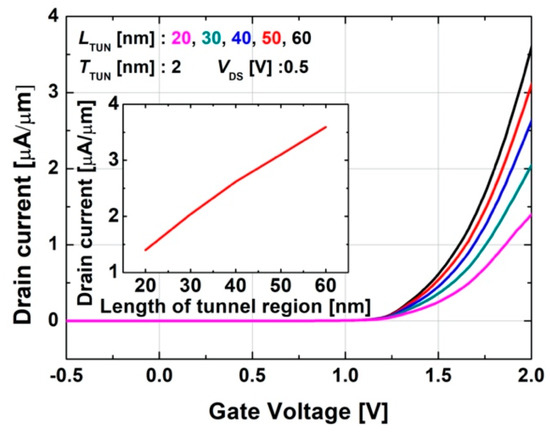 (Simulation) ID-VGS curves of SCNW TFET with 2 nm-TTUN and 0.5 V-VDS depending on the LTUN. The inset shows ION as a function of LTUN. For the SCNW TFET, the ION increases proportional to LTUN.