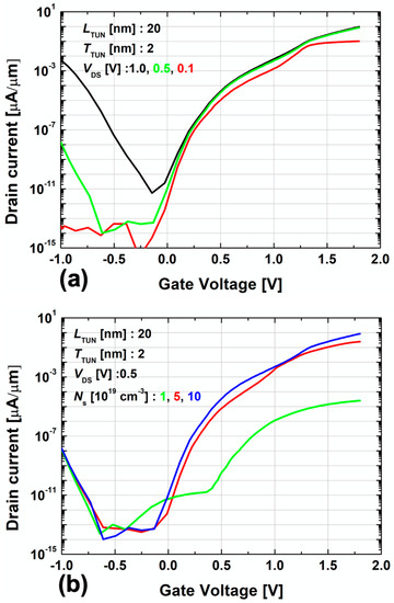 - Kim, S.W.; Choi, W.Y.; Sun, M.C.; Kim, H.W.; Park, B.G. Design guideline of Si-based L-shaped tunneling field-effect transistors. Jpn. J. Appl. Phys. 2012, 51, 06FE09. [Google Scholar] [CrossRef]