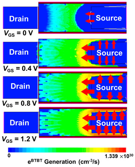 where F0 = 1 V/m, P = 2.5 for indirect BTBT, A = 4.0 × 1014 cm−1·s−1, and B = 1.9 × 107 V·cm−1 are the Kane’s model parameters and F is the electric field [34]. The pre-factor A and the exponential factor B parameter are calibrated by referring [17].