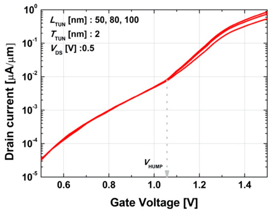 - Kim, S.W.; Choi, W.Y. Hump Effects of Germanium/Silicon Heterojunction Tunnel Field-Effect Transistors. IEEE Trans. Electron Devices 2016, 63, 2583–2588. [Google Scholar] [CrossRef]