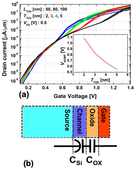 (Simulation) (a) Log(ID)-VGS curves of SCNW TFET according to TTUN with the various LTUN. The inset shows that the VHUMP is clearly decreased as TTUN increases. (b) (Calculation) The capacitance model in the area of SCNW TFET where vertical-BTBT occurs.