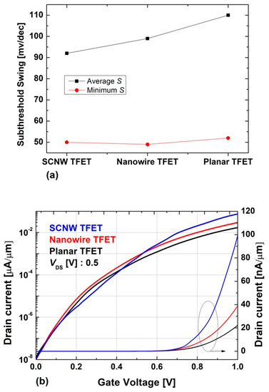 Figure 7 shows transfer curves with various TTUN from 2 to 8 nm, where LTUN and VDS are fixed at 20 nm and 0.5 V, respectively. According to the results, the ID is clearly increased, and S is deteriorated as TTUN becomes thinner. It is attributed to the enhanced vertical-BTBT rate with the smaller TTUN, because the tunnel resistance (i.e., tunnel barrier width) of SCNW TFET is geometrically determined by the TTUN [39]. However, an aggressive scaling-down of TTUN is contradictory to the process capability and the S which gets worse as the TTUN decreases due to an increased VHUMP. Consequently, an optimization of TTUN can be a strategy for SCNW TFET to compensate its weakness (i.e., low ION and hump effect) and/or enhance its strength (i.e., under 60 mV/dec-S at room temperature). Finally, TTUN is optimized as 4 nm. Then, the performances of planar TFET, SCNW TFETs and nanowire TFET are compared. Figure 8a shows the average subthreshold swing (Savg) and point-to-point minimum subthreshold swing (Smin) of SCNW, nanowire and planar TFETs. The Savg is defined as the average inverse slope of the transfer curve while ID changes from 10−12 μA/ μm to 10−2 μA/ μm. For Smin, the planar TFET, SCNW TFETs and nanowire TFET show similar values, all of which are less than 60 mV/dec. For Savg, SCNW TFET shows the lowest value. Figure 8b shows transfer curve of planar TFET, SCNW TFETs and nanowire TFET. For fair comparison, the IOFF of these devices should be adjusted to the same level. The above adjustment is achieved by changing the work function and channel doping concentration. The adjusted IOFF is 10−7 μA/μm, referring to actual IOFF in nanowire TFET [40]. The Figure 8b shows that the SCNW TFET has a larger ION than that of the planar and nanowire TFETs. In detail, its ION is enhanced 2.4 times more than that of nanowire TFET and 4.7 times more than that of planar TFET. In addition, the SCNW TFET shows higher ION than other devices at 0.53 V-VGS and fully operates within 0.7 V-VGS.