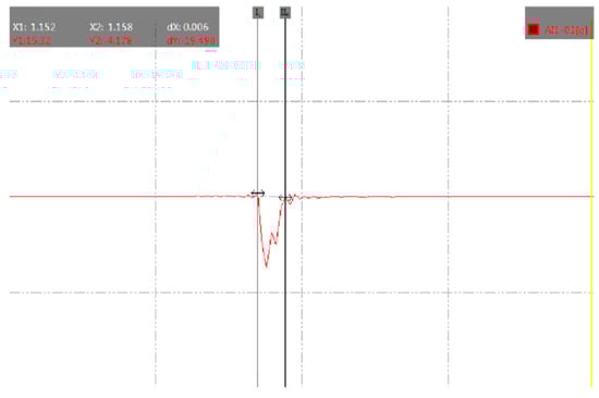 In this study, ten repeated operations for each test condition were designed. The transverse (X-direction and Y-direction) and the vertical (Z-direction) acceleration vibration waves are collected by the sensor, which is illustrated in Figure 4 as an example. In Figure 4, the horizontal axis represents time (s) and the vertical axis represents acceleration (m/s2). The peak acceleration value of each wave is recorded, and the average value of ten acceleration peaks is calculated as the representative value to conduct the analysis of the vibration isolation effect. The results of the indoor impact test under different test conditions (different thickness of XPS plates and different falling heights of the drop hammer) are listed in Table 4. It should be mentioned here that the direction of the traffic load was not included in this study, so the acceleration values were supposed to be no different in the X- and Y- direction. However, there was a certain difference between the acceleration values of Table 4, which may have resulted from the fact that the load was applied and the sensor was not completely in the center of the X–Y plane.
