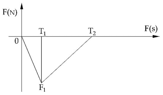 This counter impulse can be simulated by the triangular pulse shape [20,21], which is presented in Figure 2. Just as shown, F1 is the maximum point of the counterforce and T1 is the interaction time. F1 is regarded as the load force in the analysis. In this study, the action time of the impact load was about 0.006 s. Based on the collected data of the load test, the impact load force and the corresponding stress of the drop hammer falling from different heights were calculated, which are listed in Table 3.