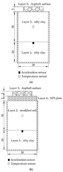 Three test groups, the silty clay, the modified soil, and the composite subgrade structure, respectively, were designed to study the vibration isolation effect. The three test groups were named as G (group) 1, G2, and G3, respectively, and G1 and G3 are presented in Figure 3. For G1, the mold box was completely filled with silty clay. As for the other two groups, the upper 30 cm of the soils were replaced by the modified soil and the composite subgrade structure, respectively. The sensor was buried at the depth of 30 cm, which was exactly the bottom of the modified soils. In G3, different thicknesses (3 cm, 5 cm, and 9 cm) of the XPS plates were used to determine the optimum thickness of the XPS plates. When testing, a slab of bitumen mixture (the size of 5 cm × 20 cm × 20 cm) was placed at the top of the test groups. The impact applying device was put on the surface of the asphalt mixture. The drop height of the hammer was set as 5 cm, 10 cm, 15 cm, 20 cm, and 25 cm to simulate the vibration waves of different intensities. As the drop hammer fell down, the vibration waves generated and propagated through the different layers. Accelerations of the fierce vibration could be collected by the sensor. The vibration isolation effect of the three test groups was assessed by a series of impact load tests.